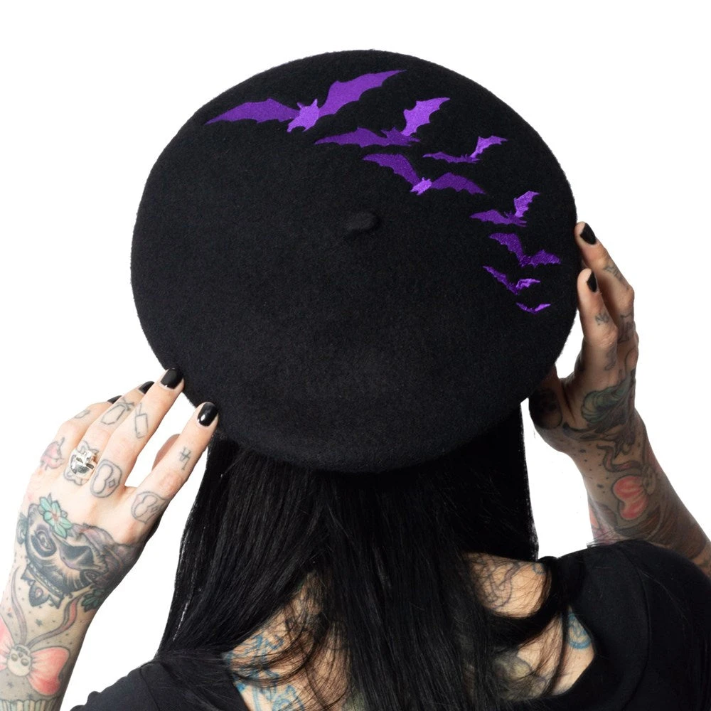 Go batty with Kreepsville’s beatnik berets! 90% wool 10% polyester berets, embroidered bat motif on top and front. One size fits most.