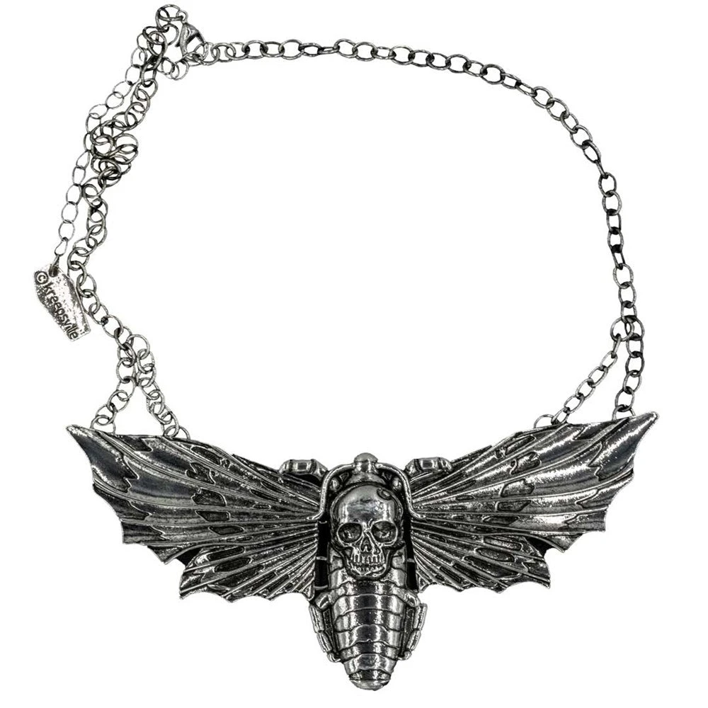 Kreepsville introduces the Death Moth Necklace, a hauntingly beautiful accessory that will captivate the lovers of oddities and curiosities. This chrome death hawk moth pendant is composed of 3 separate parts linked together so it lays just right. Moth pendant measures approx 5″ W (12.7 cm) x 2″ H (5 cm) and metal chain length approx. 12″ (30.5 cm) with 3″ (7.6 cm) extender. Designed in California.