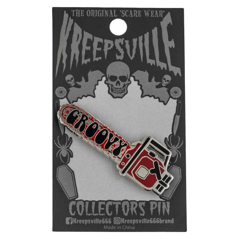 Get ready to fight off the undead with Kreepsville’s Groovy Chainsaw Enamel Pin and it won’t even cost you an arm! Approx. 2″ W (5 cm) x 0.5″ H (1.5 cm). Designed in California.