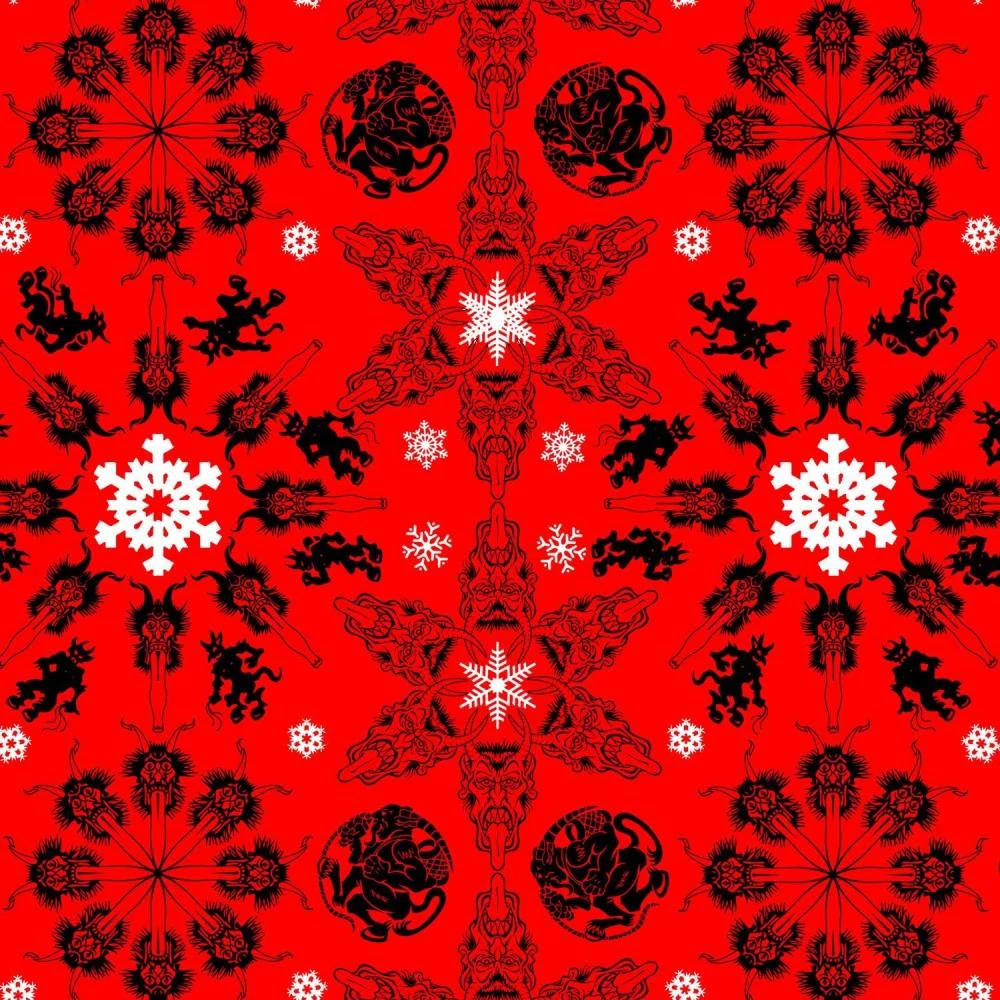 Kreespville 666 Krampus xmas print pencil dress, off shoulder figure hugging pencil dress with black contrast waist and hem detail. 95% Polyester 5% spandex dress, made by monsters in the USA