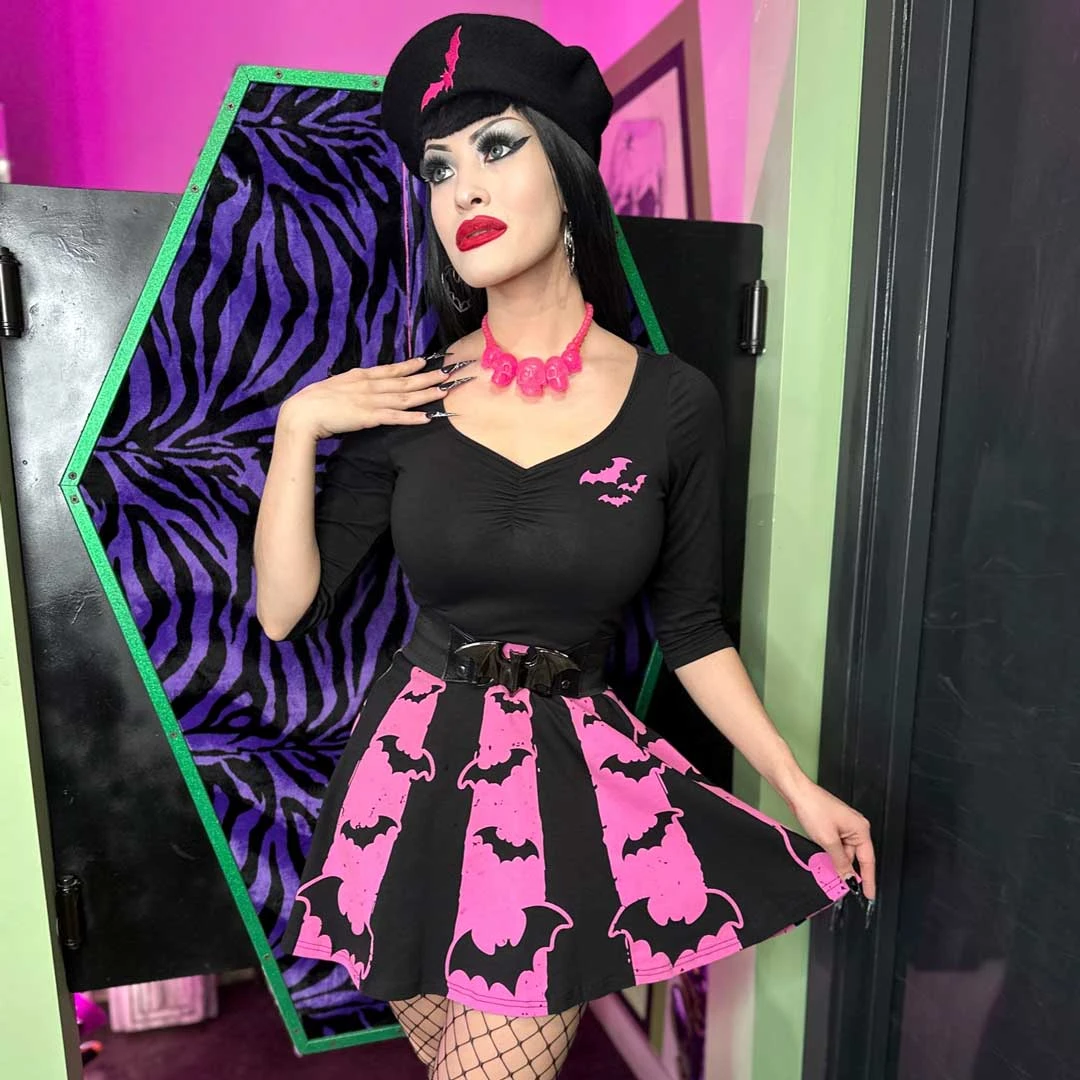 Sparkle like a scene queen with the Kreepsville Skull Collection Necklace in pink glitter! This spooktacular necklace is sure to add some poison glamour to any look. Featuring resin skull beads, an adjustable neck extender and coffin charm, you’ll be ready to turn heads wherever you go. Size of large skull approx 1.75″ high. Necklace is 14in (35.5cm) and 17.5in (44.4cm) with extension.