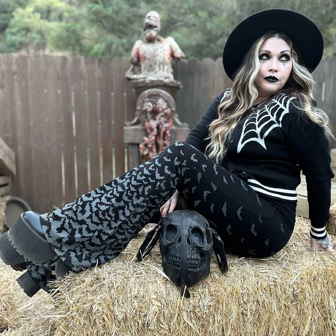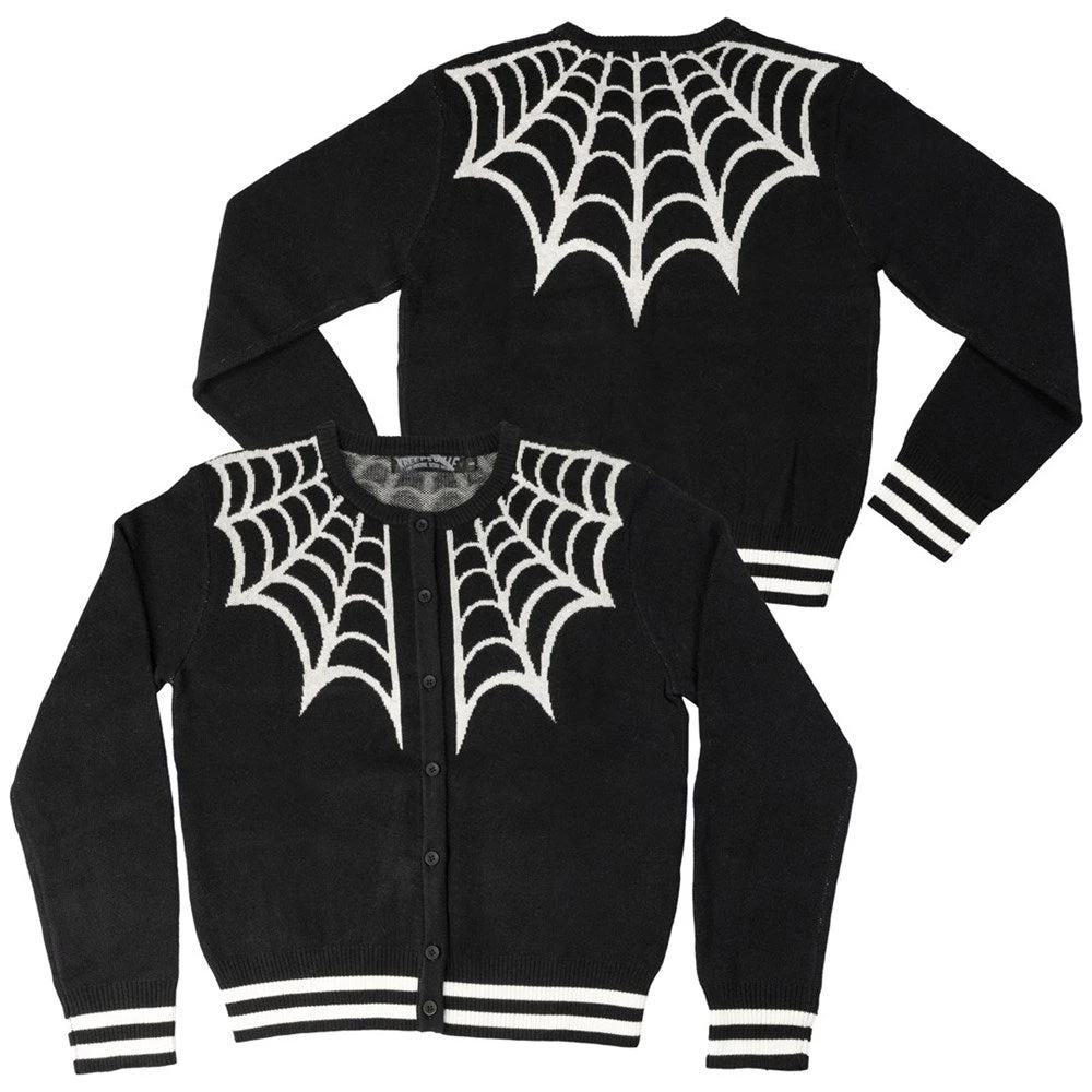 This button down Spider Web White Cardigan by Kreepsville will add some spider-rific style to your spooky wardrobe! This creepy knit cardigan features white web designs across the front and back and contrast white stripe detail on hem and cuffs. Crafted from 100% cotton for a warm and comfortable fit even on the most chilling nights! Designed in California.