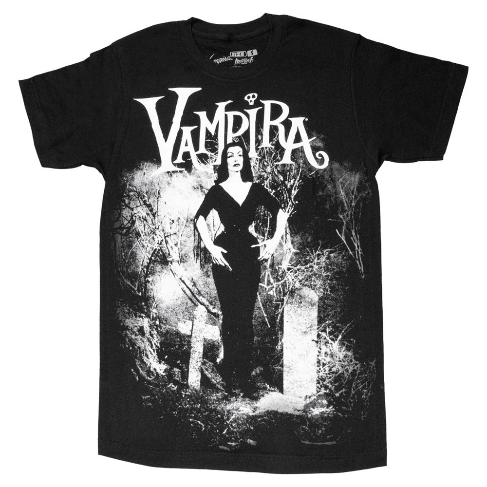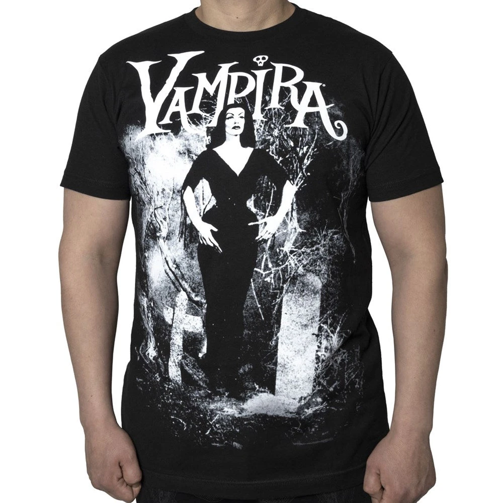 Official Vampira Jumbo print t-shirt by Kreepsville. It’s ghoul-rilas in the mist on this jumbo print tee. Observe Vampira in her natural habit, the cemetery, printed edge to edge with soft feel jumbo print. Designed and Printed in the USA.